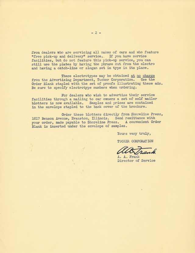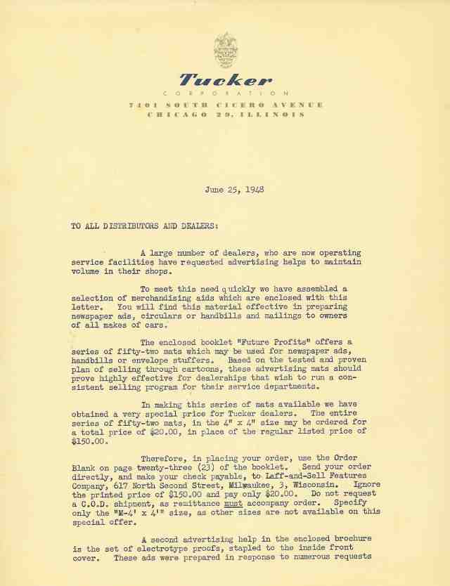 Pictures of Two Letters Issued From the Tucker Company to Dealerships. Click on a picture to see a larger version.